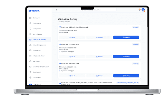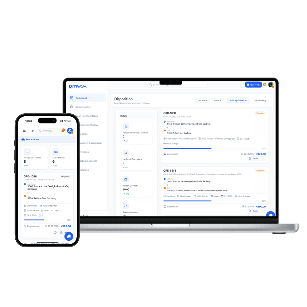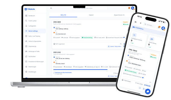 TRAVA verbindet Speditionen und Fahrer auf einer zentralen Plattform mit klaren Preisen, direkten Aufträgen und transparenter Abwicklung.