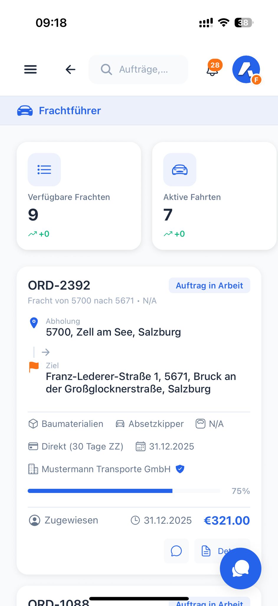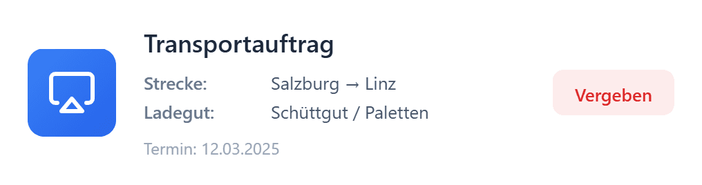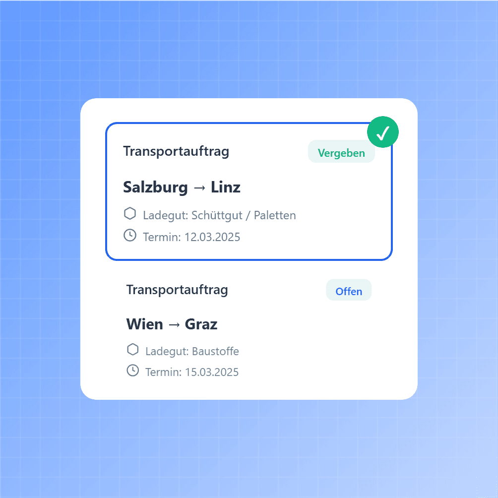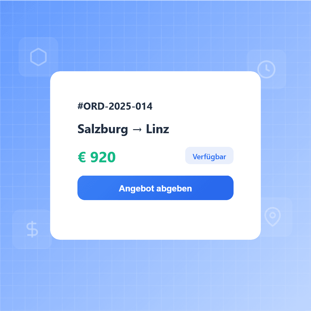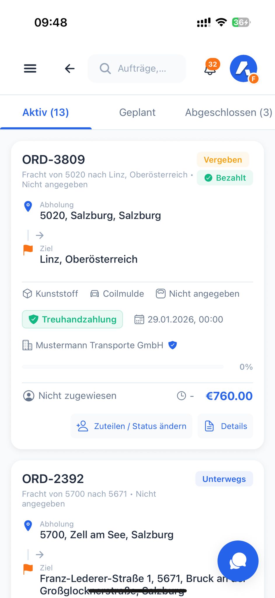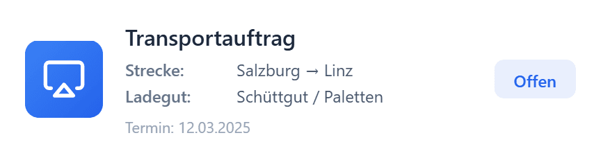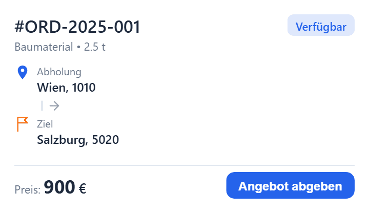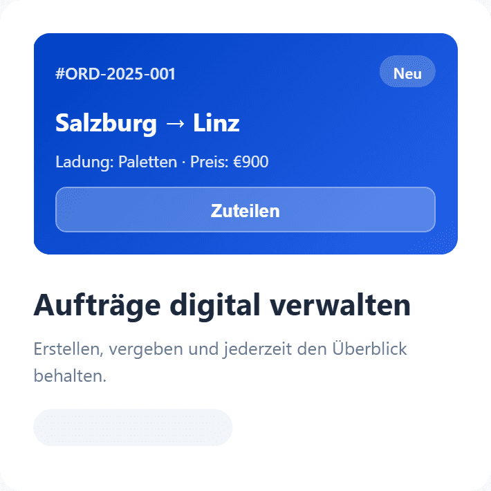 Erstelle Transportaufträge, behalte Preise, Strecken und Status im Blick und vergebe Aufträge direkt an passende Fahrer oder Speditionen.