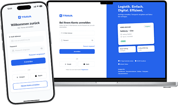 TRAVA ist eine digitale Plattform zur Verwaltung von Transportaufträgen – von der Erstellung über die Vergabe bis zum Live-Status.
